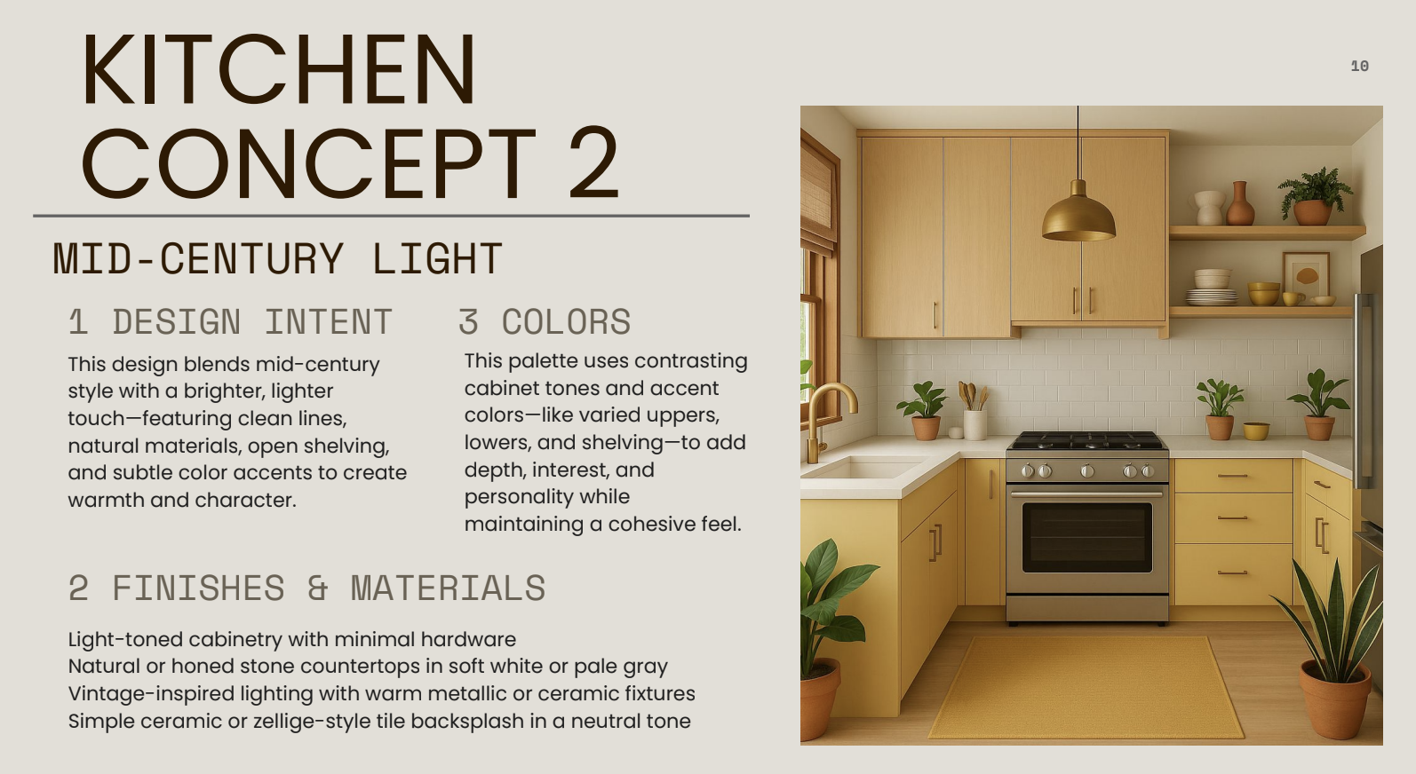 Next, we developed a Design Concept Board. For the kitchen, this included a range of layout options to enhance function and storage in a small footprint, paired with aesthetic choices that reflected the client’s modern taste—clean cabinetry lines, muted color tones, and a more open feel near the entry.