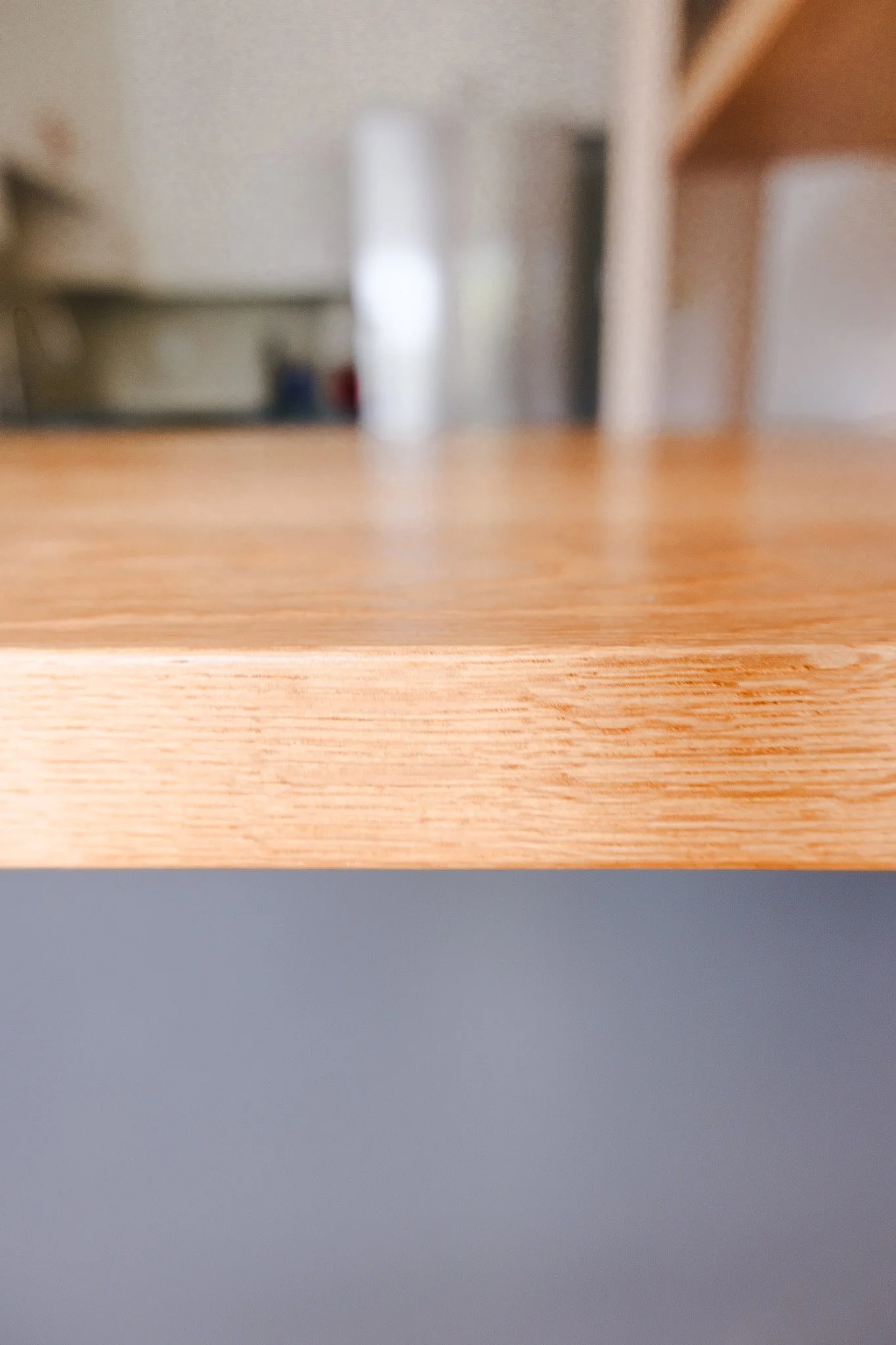 Countertops: A custom white oak wood countertop from Revival Millworks, used to create a bar top after closing off one kitchen entrance — improving flow while adding a welcoming gathering space