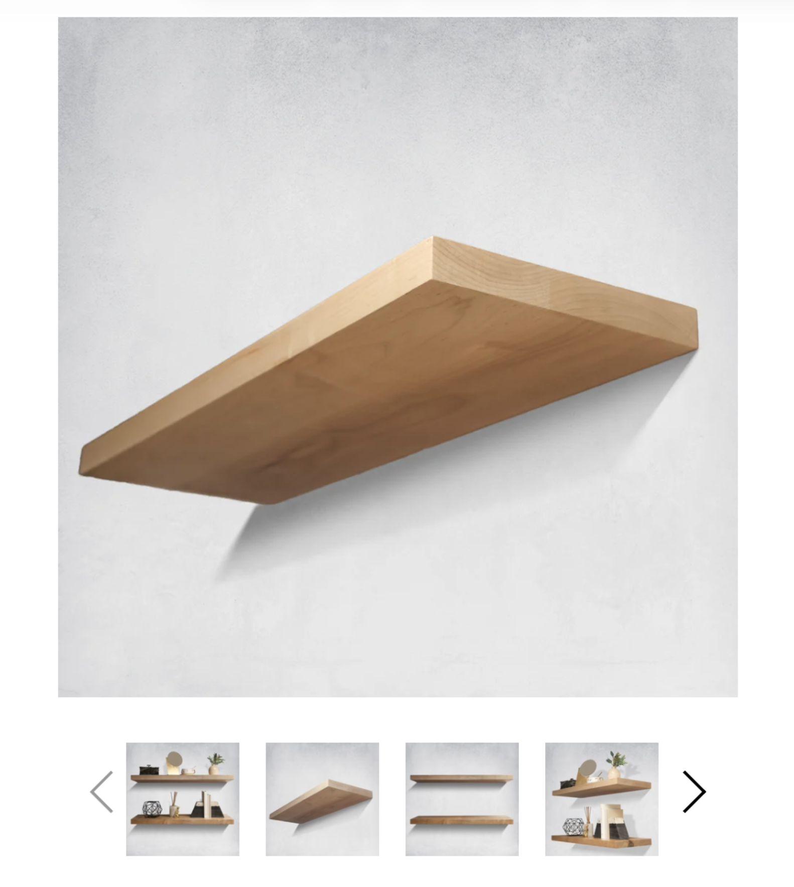 Custom maple floating shelves by Urbandi bring warmth and provide space to display everyday items without sacrificing functionality.