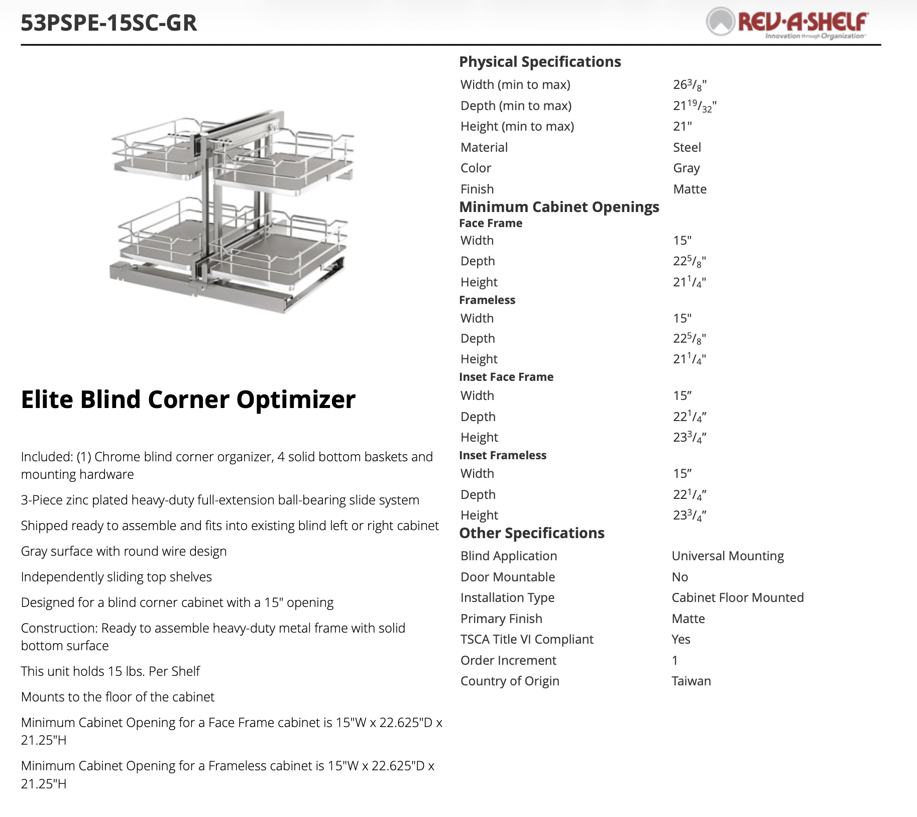 To solve the corner cabinet issue, we reconfigured the cabinetry and installed Rev-A-Shelf blind corner organizers, transforming previously wasted space into highly functional storage. What once couldn’t be accessed at all is now one of the most useful parts of the kitchen.